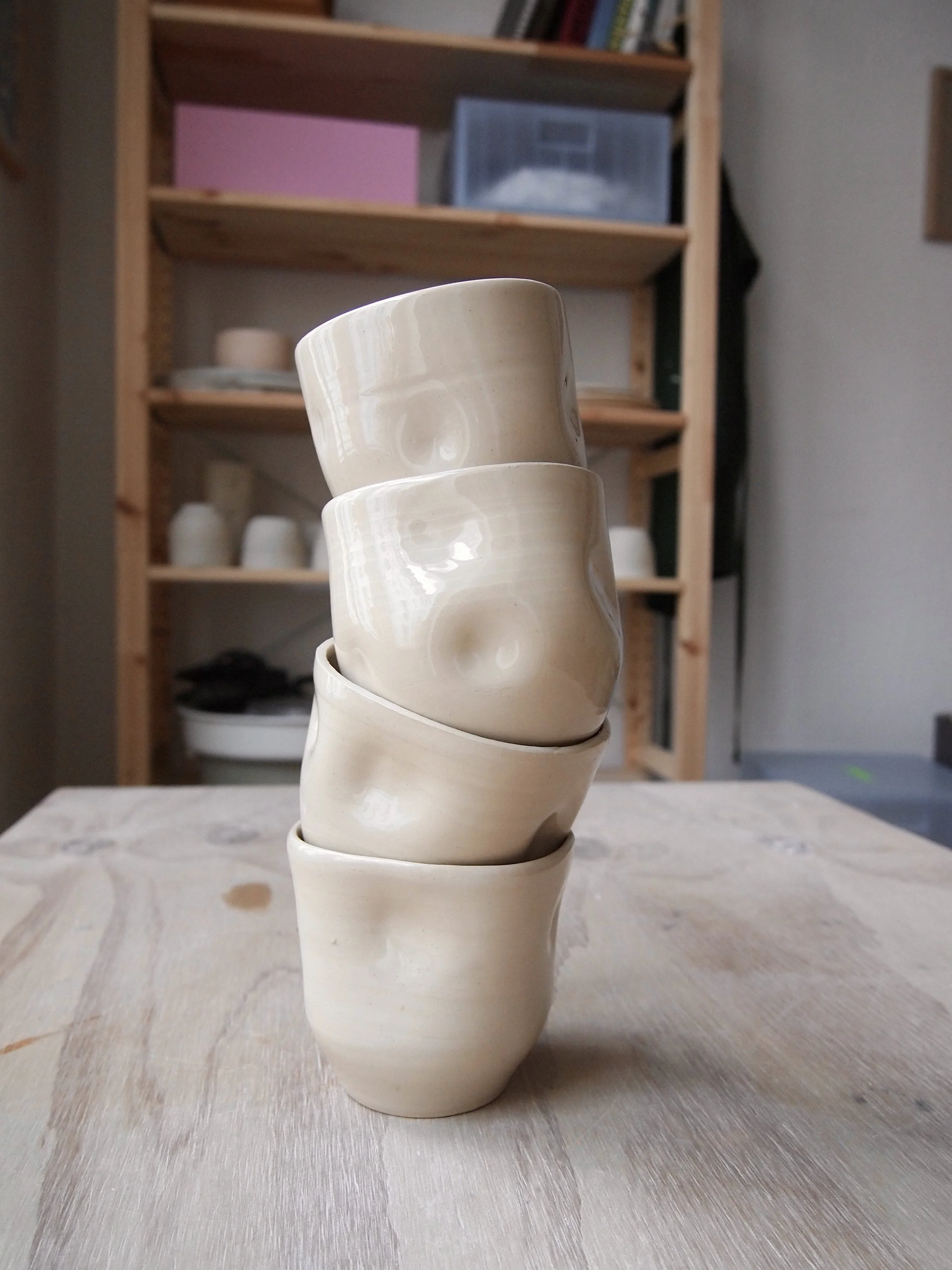 Bitte reinige außerdem den Boden deiner Stücke gründlich, sodass keine Glasur auf der Standfläche ist. Sollte das der Fall sein, wird dein Stück vermutlich an der Ofenplatte festkleben, sodass nur noch der Hammer helfen kann.